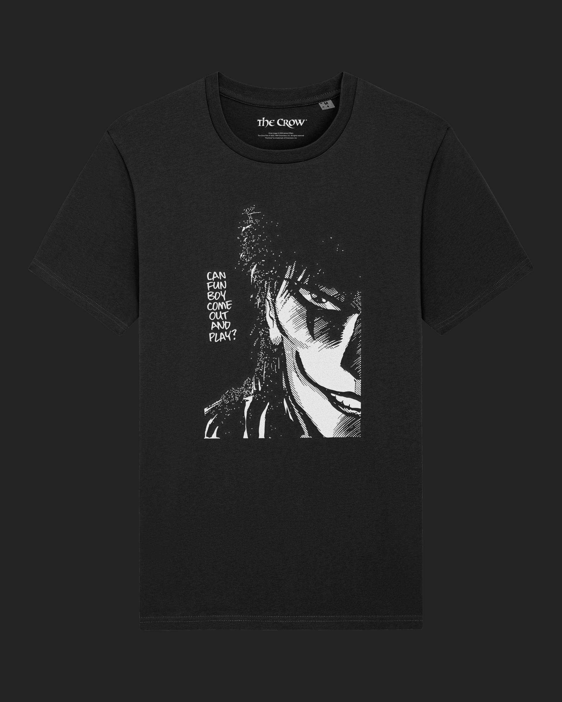 The Crow Calling Fun Boy graphic t-shirt is a cotton garment featuring an extract from the graphic novel The Crow by James O'Barr (1989).