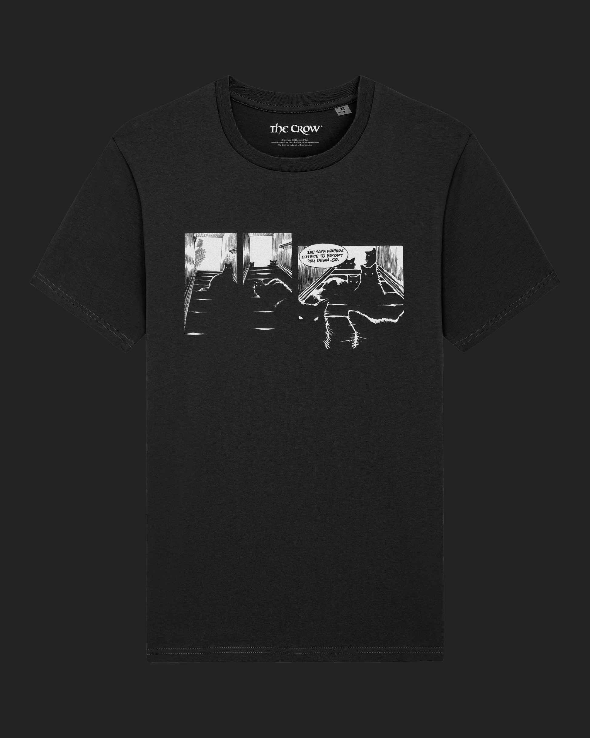 The Crow Friends Outside graphic t-shirt is a cotton garment featuring an extract from the graphic novel The Crow by James O'Barr (1989).