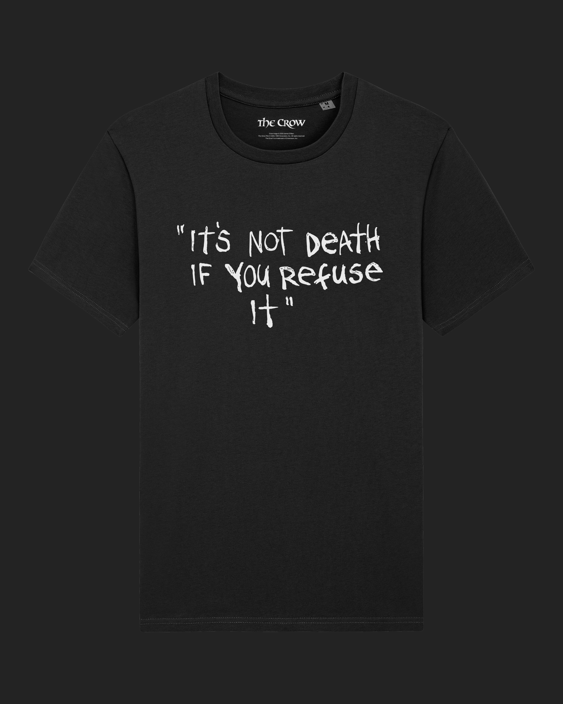 The Crow It's Not Death If You Refuse It graphic t-shirt is a cotton garment featuring an extract and quote from the graphic novel The Crow by James O'Barr (1989).