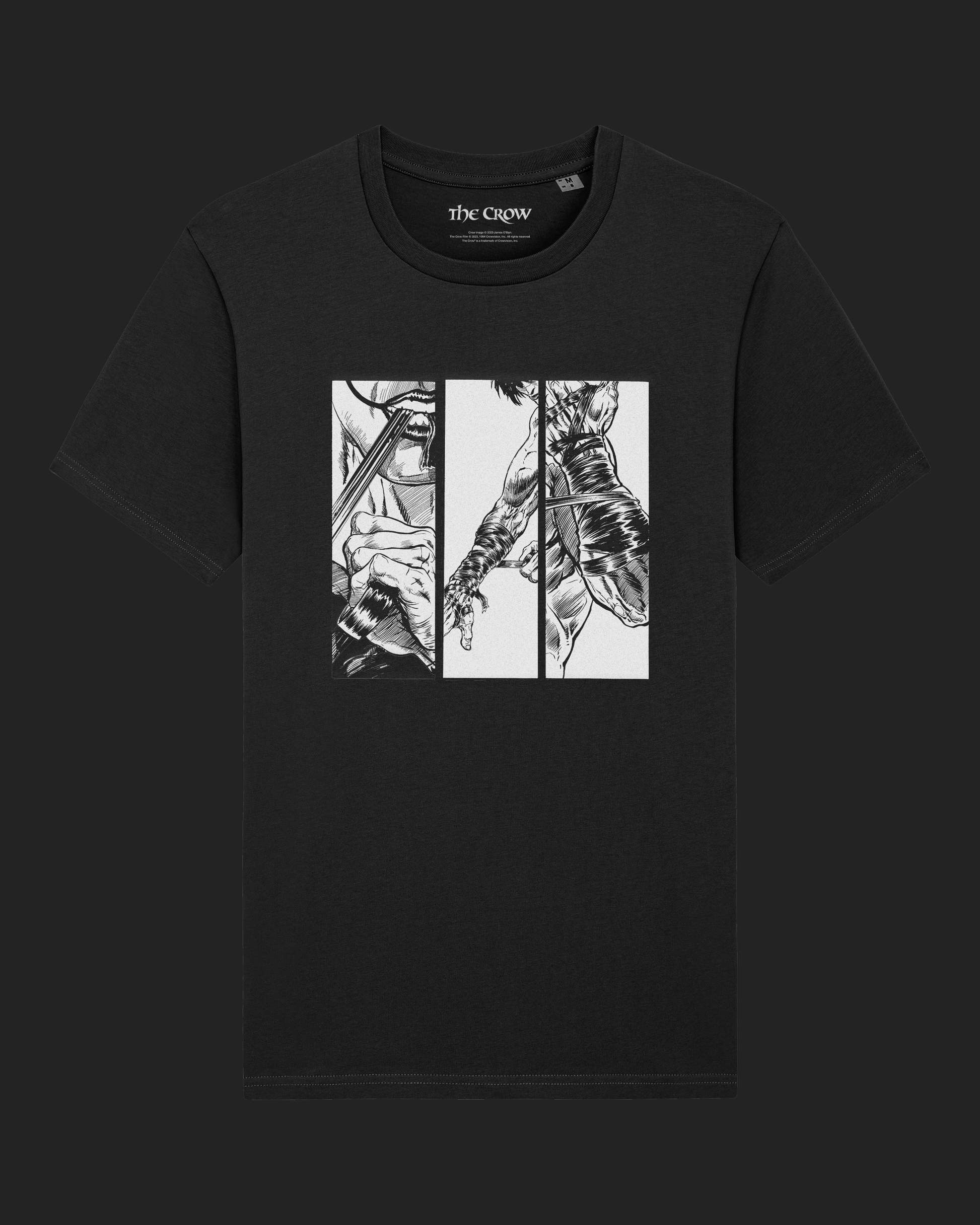 The Crow Strapping graphic t-shirt is a premium cotton garment featuring an extract from the graphic novel The Crow by James O'Barr (1989).